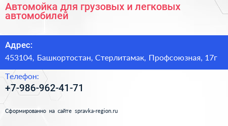 Автомойка для грузовых и легковых автомобилей по адресу 453104, Башкортостан, Стерлитамак, Профсоюзная, 17г в дальнейшем Организация, размещена в следующих категориях: