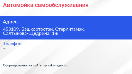 Автомойка самообслуживания по адресу 453109, Башкортостан, Стерлитамак, Салтыкова-Щедрина, 1ж в дальнейшем Организация, размещена в следующих категориях: