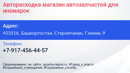 Авторасходка, магазин автозапчастей для иномарок по адресу 453116, Башкортостан, Стерлитамак, Глинки, 9 в дальнейшем Организация, размещена в следующих категориях:
