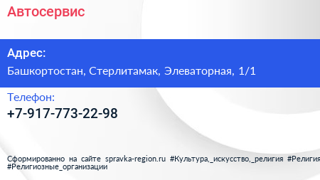 Автосервис по адресу Башкортостан, Стерлитамак, Элеваторная, 1/1 в дальнейшем Организация, размещена в следующих категориях: