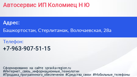 Автосервис, ИП Коломиец Н.Ю. по адресу Башкортостан, Стерлитамак, Волочаевская, 28а в дальнейшем Организация, размещена в следующих категориях: