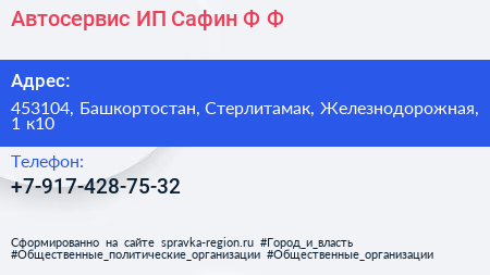 Автосервис, ИП Сафин Ф.Ф. по адресу 453104, Башкортостан, Стерлитамак, Железнодорожная, 1 к10 в дальнейшем Организация, размещена в следующих категориях: