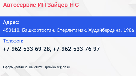 Автосервис, ИП Зайцев Н.С. по адресу 453118, Башкортостан, Стерлитамак, Худайбердина, 198а в дальнейшем Организация, размещена в следующих категориях:
