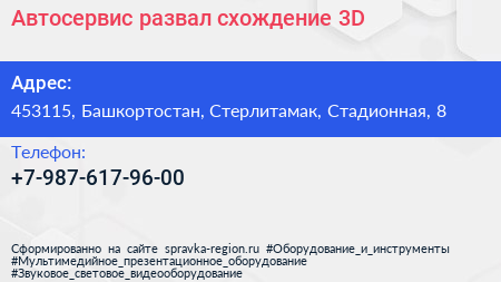 Автосервис развал-схождение 3D по адресу 453115, Башкортостан, Стерлитамак, Стадионная, 8 в дальнейшем Организация, размещена в следующих категориях: