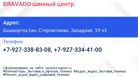 BRAVADO, шинный центр по адресу Башкортостан, Стерлитамак, Западная, 19 к1 в дальнейшем Организация, размещена в следующих категориях: