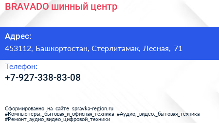 BRAVADO, шинный центр по адресу 453112, Башкортостан, Стерлитамак, Лесная, 71 в дальнейшем Организация, размещена в следующих категориях: