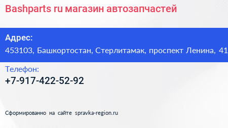 Bashparts.ru, магазин автозапчастей по адресу 453103, Башкортостан, Стерлитамак, проспект Ленина, 41 в дальнейшем Организация, размещена в следующих категориях: