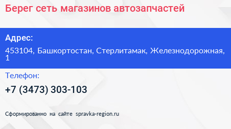 Берег, сеть магазинов автозапчастей по адресу 453104, Башкортостан, Стерлитамак, Железнодорожная, 1 в дальнейшем Организация, размещена в следующих категориях: