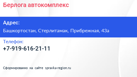 Берлога, автокомплекс по адресу Башкортостан, Стерлитамак, Прибрежная, 43а в дальнейшем Организация, размещена в следующих категориях:
