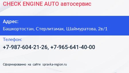 CHECK ENGINE AUTO, автосервис по адресу Башкортостан, Стерлитамак, Шаймуратова, 2в/1 в дальнейшем Организация, размещена в следующих категориях: