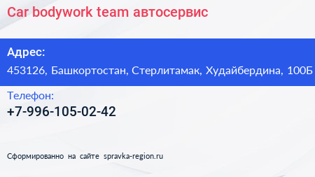 Car bodywork team, автосервис по адресу 453126, Башкортостан, Стерлитамак, Худайбердина, 100Б в дальнейшем Организация, размещена в следующих категориях: