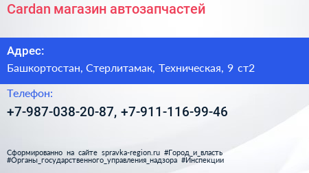 Cardan, магазин автозапчастей по адресу Башкортостан, Стерлитамак, Техническая, 9 ст2 в дальнейшем Организация, размещена в следующих категориях: