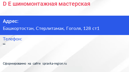D & E, шиномонтажная мастерская по адресу Башкортостан, Стерлитамак, Гоголя, 128 ст1 в дальнейшем Организация, размещена в следующих категориях: