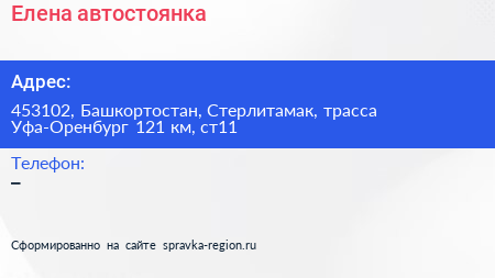 Елена, автостоянка по адресу 453102, Башкортостан, Стерлитамак, трасса Уфа-Оренбург 121 км, ст11 в дальнейшем Организация, размещена в следующих категориях: