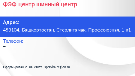 ФЭФ-центр, шинный центр по адресу 453104, Башкортостан, Стерлитамак, Профсоюзная, 1 к1 в дальнейшем Организация, размещена в следующих категориях: