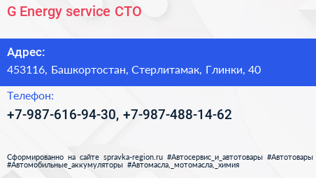G-Energy service, СТО по адресу 453116, Башкортостан, Стерлитамак, Глинки, 40 в дальнейшем Организация, размещена в следующих категориях: