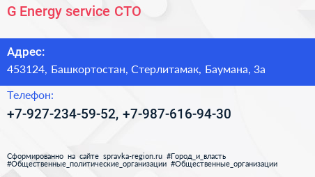 G-Energy service, СТО по адресу 453124, Башкортостан, Стерлитамак, Баумана, 3а в дальнейшем Организация, размещена в следующих категориях: