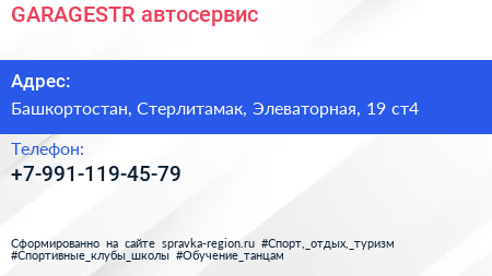 GARAGESTR, автосервис по адресу Башкортостан, Стерлитамак, Элеваторная, 19 ст4 в дальнейшем Организация, размещена в следующих категориях: