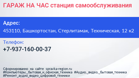 ГАРАЖ НА ЧАС, станция cамообслуживания по адресу 453110, Башкортостан, Стерлитамак, Техническая, 12 к2 в дальнейшем Организация, размещена в следующих категориях: