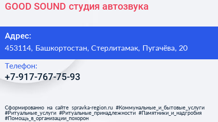 GOOD SOUND, студия автозвука по адресу 453114, Башкортостан, Стерлитамак, Пугачёва, 20 в дальнейшем Организация, размещена в следующих категориях: