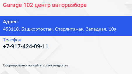 Garage 102, центр авторазбора по адресу 453118, Башкортостан, Стерлитамак, Западная, 10а в дальнейшем Организация, размещена в следующих категориях: