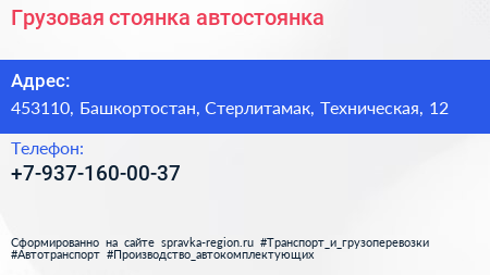 Грузовая стоянка, автостоянка по адресу 453110, Башкортостан, Стерлитамак, Техническая, 12 в дальнейшем Организация, размещена в следующих категориях: