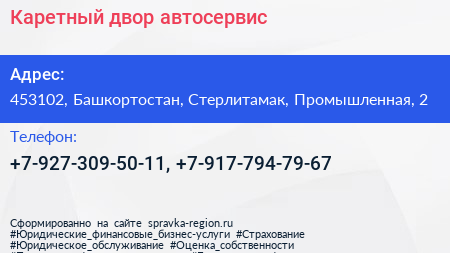 Каретный двор, автосервис по адресу 453102, Башкортостан, Стерлитамак, Промышленная, 2 в дальнейшем Организация, размещена в следующих категориях: