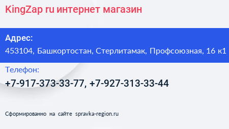 KingZap.ru, интернет-магазин по адресу 453104, Башкортостан, Стерлитамак, Профсоюзная, 16 к1 в дальнейшем Организация, размещена в следующих категориях: