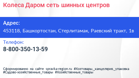 Колеса Даром, сеть шинных центров по адресу 453118, Башкортостан, Стерлитамак, Раевский тракт, 1в в дальнейшем Организация, размещена в следующих категориях: