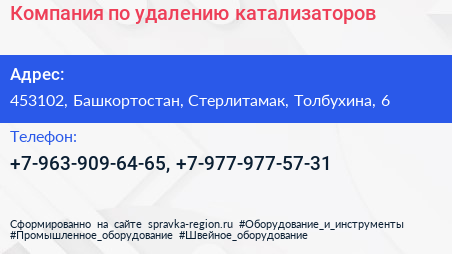 Компания по удалению катализаторов по адресу 453102, Башкортостан, Стерлитамак, Толбухина, 6 в дальнейшем Организация, размещена в следующих категориях:
