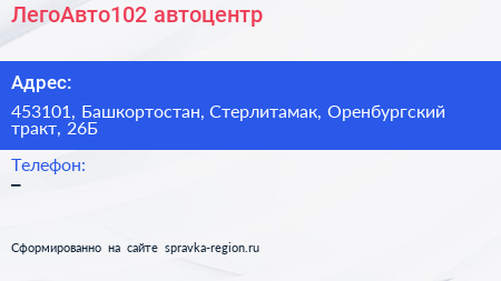 ЛегоАвто102, автоцентр по адресу 453101, Башкортостан, Стерлитамак, Оренбургский тракт, 26Б в дальнейшем Организация, размещена в следующих категориях: