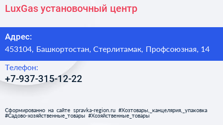 LuxGas, установочный центр по адресу 453104, Башкортостан, Стерлитамак, Профсоюзная, 14 в дальнейшем Организация, размещена в следующих категориях: