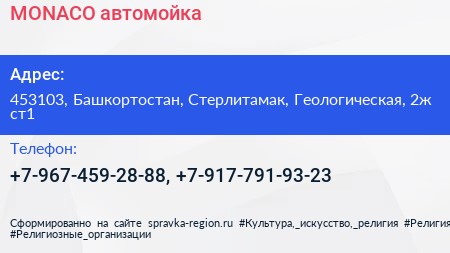 MONACO, автомойка по адресу 453103, Башкортостан, Стерлитамак, Геологическая, 2ж ст1 в дальнейшем Организация, размещена в следующих категориях: