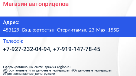 Магазин автоприцепов по адресу 453129, Башкортостан, Стерлитамак, 23 Мая, 155Б в дальнейшем Организация, размещена в следующих категориях: