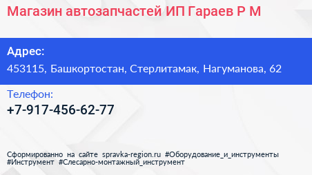 Магазин автозапчастей, ИП Гараев Р.М. по адресу 453115, Башкортостан, Стерлитамак, Нагуманова, 62 в дальнейшем Организация, размещена в следующих категориях: