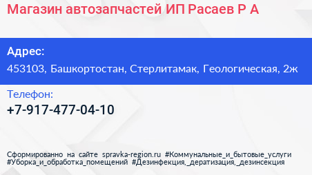 Магазин автозапчастей, ИП Расаев Р.А. по адресу 453103, Башкортостан, Стерлитамак, Геологическая, 2ж в дальнейшем Организация, размещена в следующих категориях: