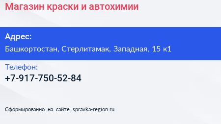 Магазин краски и автохимии по адресу Башкортостан, Стерлитамак, Западная, 15 к1 в дальнейшем Организация, размещена в следующих категориях: