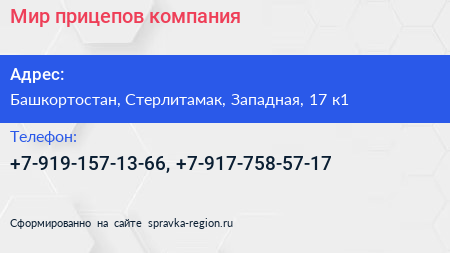 Мир прицепов, компания по адресу Башкортостан, Стерлитамак, Западная, 17 к1 в дальнейшем Организация, размещена в следующих категориях: