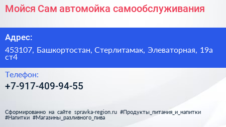 Мойся Сам, автомойка самообслуживания по адресу 453107, Башкортостан, Стерлитамак, Элеваторная, 19а ст4 в дальнейшем Организация, размещена в следующих категориях: