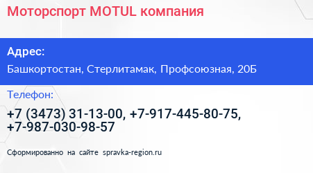 Моторспорт-MOTUL, компания по адресу Башкортостан, Стерлитамак, Профсоюзная, 20Б в дальнейшем Организация, размещена в следующих категориях: