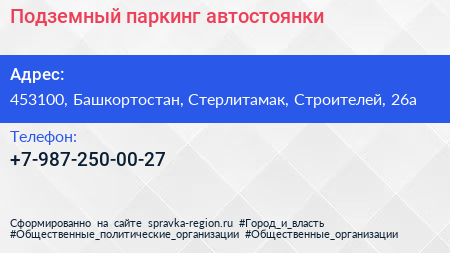 Подземный паркинг, автостоянки по адресу 453100, Башкортостан, Стерлитамак, Строителей, 26а в дальнейшем Организация, размещена в следующих категориях: