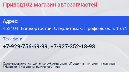 Привод102, магазин автозапчастей по адресу 453104, Башкортостан, Стерлитамак, Профсоюзная, 1 ст1 в дальнейшем Организация, размещена в следующих категориях: