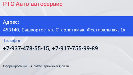 РТС Авто, автосервис по адресу 453140, Башкортостан, Стерлитамак, Фестивальная, 1а в дальнейшем Организация, размещена в следующих категориях: