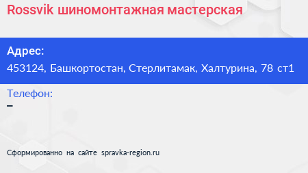 Rossvik, шиномонтажная мастерская по адресу 453124, Башкортостан, Стерлитамак, Халтурина, 78 ст1 в дальнейшем Организация, размещена в следующих категориях: