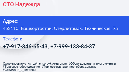 СТО Надежда по адресу 453110, Башкортостан, Стерлитамак, Техническая, 7а в дальнейшем Организация, размещена в следующих категориях: