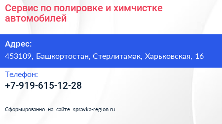 Сервис по полировке и химчистке автомобилей по адресу 453109, Башкортостан, Стерлитамак, Харьковская, 16 в дальнейшем Организация, размещена в следующих категориях: