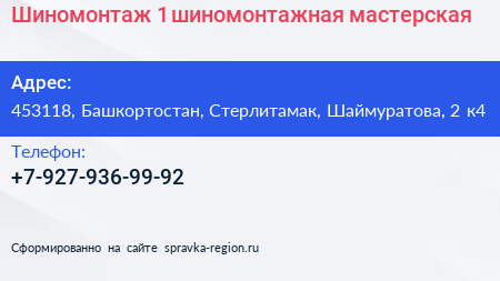 Шиномонтаж №1, шиномонтажная мастерская по адресу 453118, Башкортостан, Стерлитамак, Шаймуратова, 2 к4 в дальнейшем Организация, размещена в следующих категориях: