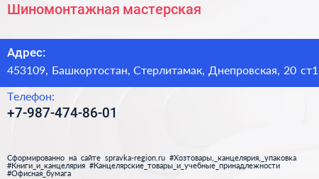 Шиномонтажная мастерская по адресу 453109, Башкортостан, Стерлитамак, Днепровская, 20 ст1 в дальнейшем Организация, размещена в следующих категориях: