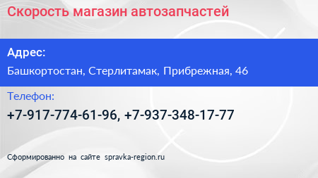 Скорость, магазин автозапчастей по адресу Башкортостан, Стерлитамак, Прибрежная, 46 в дальнейшем Организация, размещена в следующих категориях: