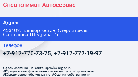 Спец-климат, Автосервис по адресу 453109, Башкортостан, Стерлитамак, Салтыкова-Щедрина, 1е в дальнейшем Организация, размещена в следующих категориях: